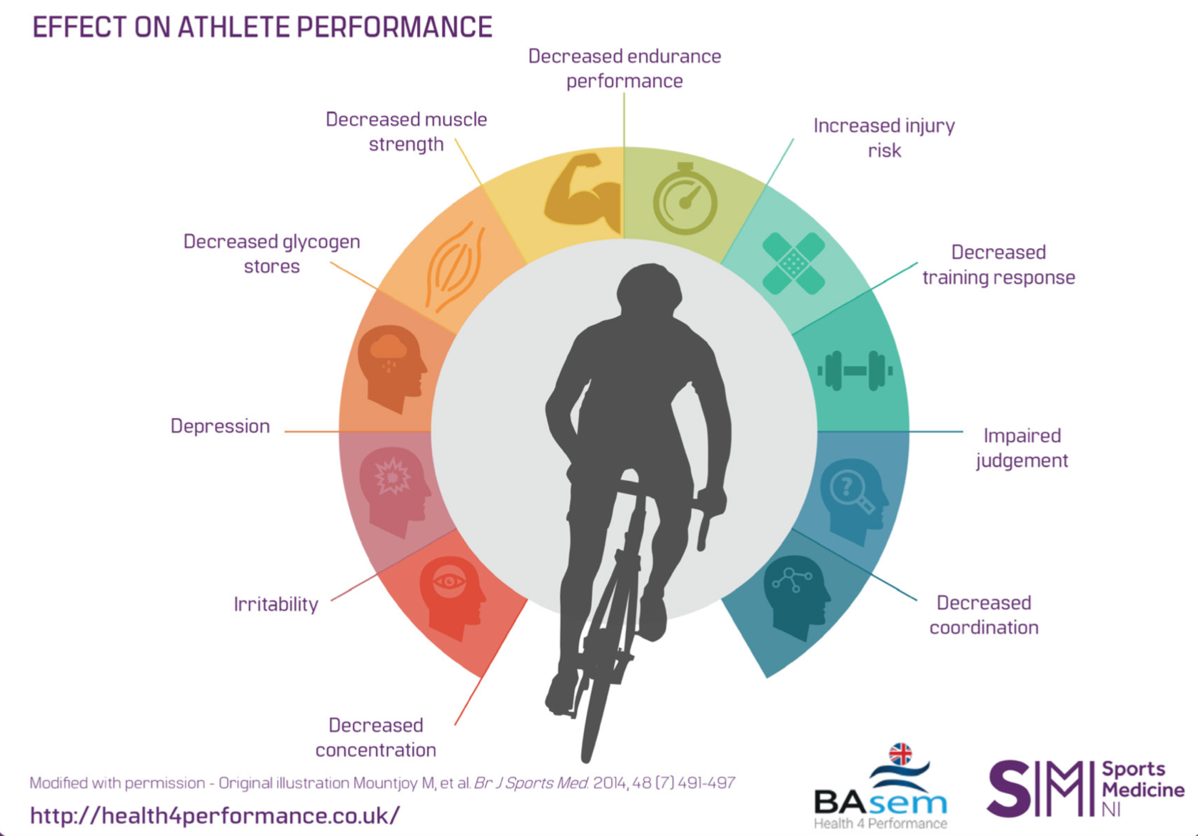Low energy availability can result in RED-S. Referred to as relative energy deficiency in sport (RED-S for short), the syndrome is associated with a number of negative effects on an athletes health and performance as illustrated in the two spoke and wheel diagrams below.